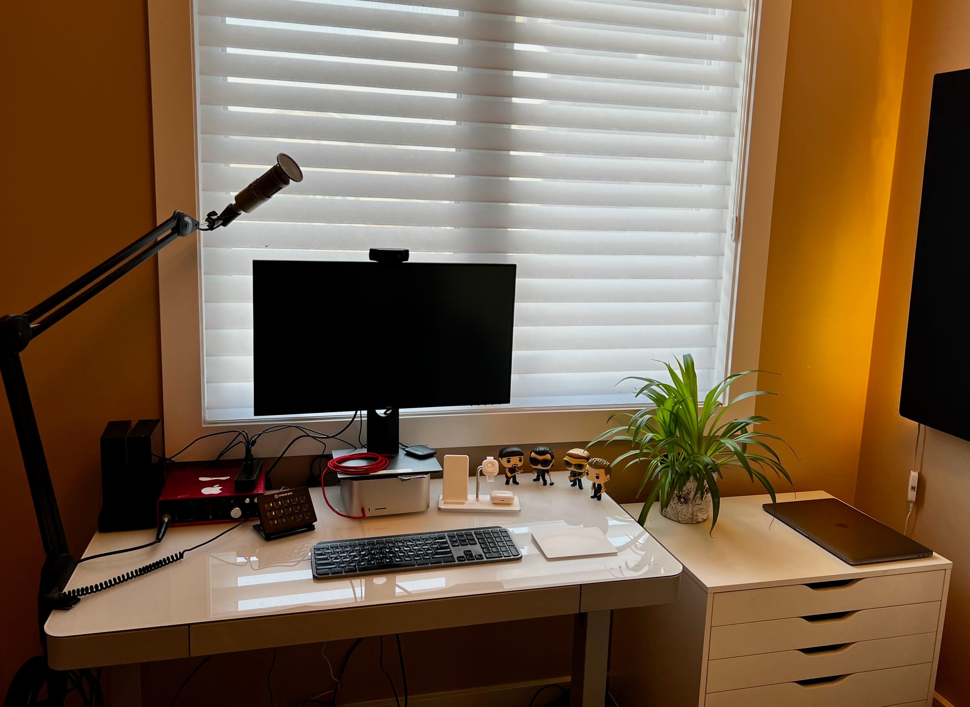 - My desk in my office is this Costco sold Tresanti Adjustable Desk. You can watch it go up and down on this Instagram video.* I sit my butt down on a version of this LÅNGFJÄLLchair from Ikea. I hated having arm rests (because guitar) and wheels on the bottom of my chair (I work alone. Where am I wheeling to?) and finally found one that works for me. My main issue with this desk is that the desktop is too thick for most mic / camera mounts.